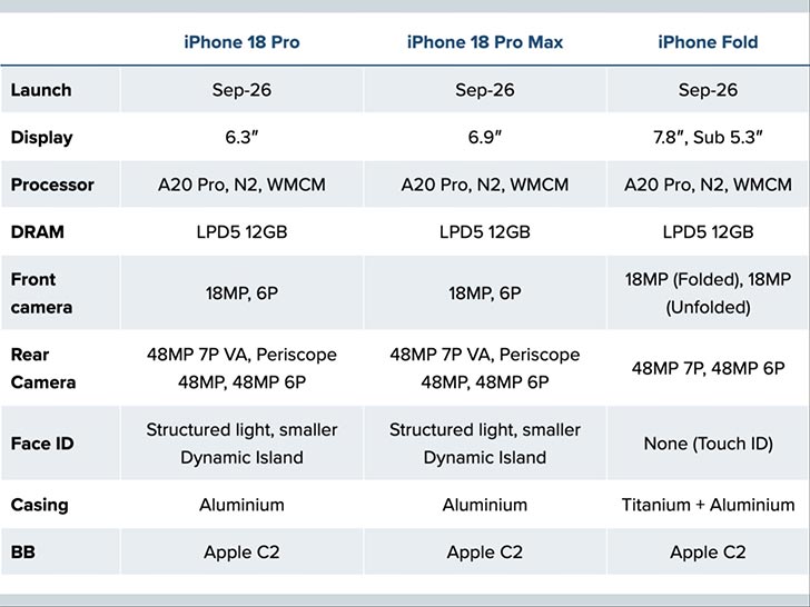 They both have that dedicated new N1 chip. 12GB of LPDDR5 memory is here. And the analyst notes an 18MP selfie camera on these handsets (same as before). No upgrades can be found in the rear camera setup either. All three sensors will be 48MP. iPhone 18 Pro and Pro Max will hide the Face ID from their 6.3” and 6.9” screens.