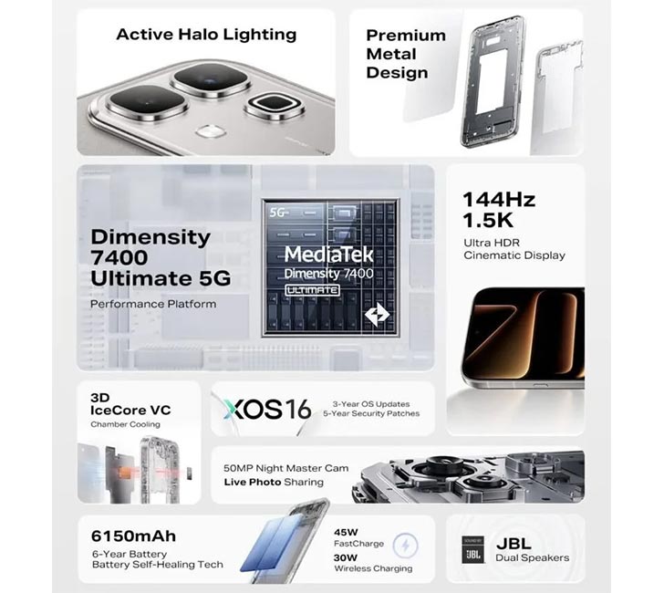 The basic Note 60 5G also has a single 8/256GB memory trim, though the chipset installed on this device is a weaker Dimensity 7400 Ultimate. It does have the same Android 16 and XOS 16 software. Infinix will drop three OS updates on each device.