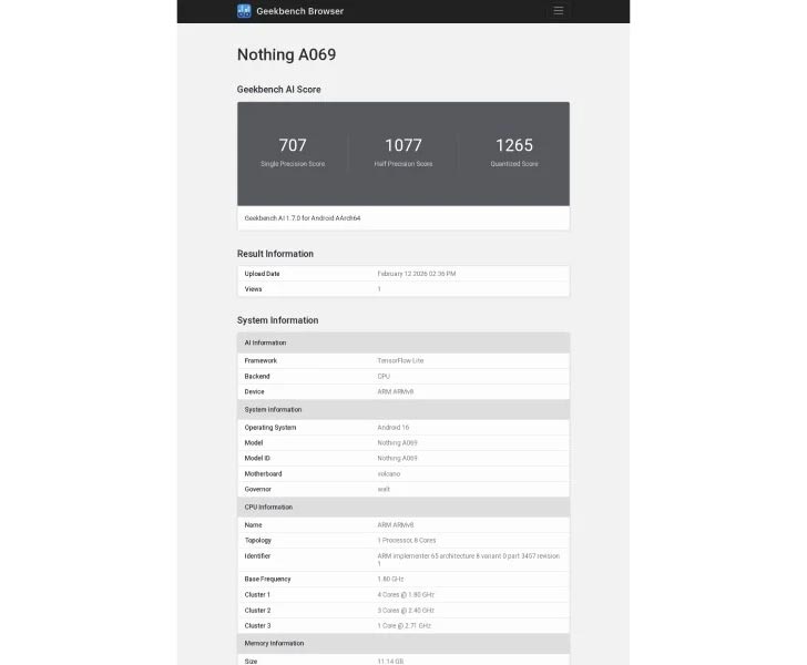 Geekbench grabbed the details of this device during the internal testing by the Nothing team. The Phone (4a) is built around an 8-core processor that has a boost clock speed of 2.71 GHz on the primary core. The other cores are split into 2.4 GHz and 1.8 GHz (efficiency) clusters.