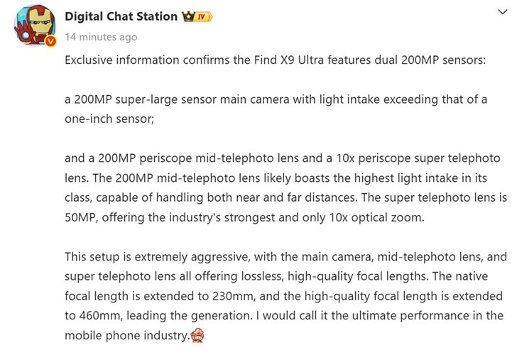 Oppo will upgrade the main and zoom camera on the Find X9 Ultra this year by making them both 200MP. Digital Chat Station has found new details about this phone’s cameras and laid them out on Weibo. Here’s the breakdown of everything the leaker shared.