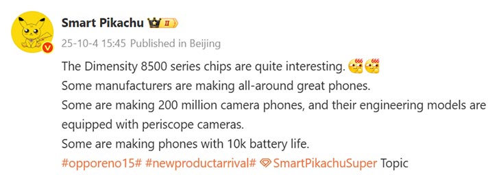 Nothing’s set in stone yet, but the possibility was indicated by Smart Pikachu on his latest Weibo post. The leaker’s track record is immaculate, so there may be something to his statement. The post says all smartphone brands are trying to develop well-rounded phones based on the Dimensity 8500 chip.