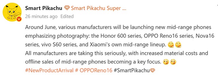 Chinese brands are whipping up more sub-flagship devices for mid-2026 release. The rumor mill has been actively trailing those handsets. There’s the Honor 600 series and the Vivo S60 lineup. HUWAEI’s Nova 16 has also been the talk of the town lately. And Oppo is all but ready to debut the Oppo Reno 16 and 16 Pro.