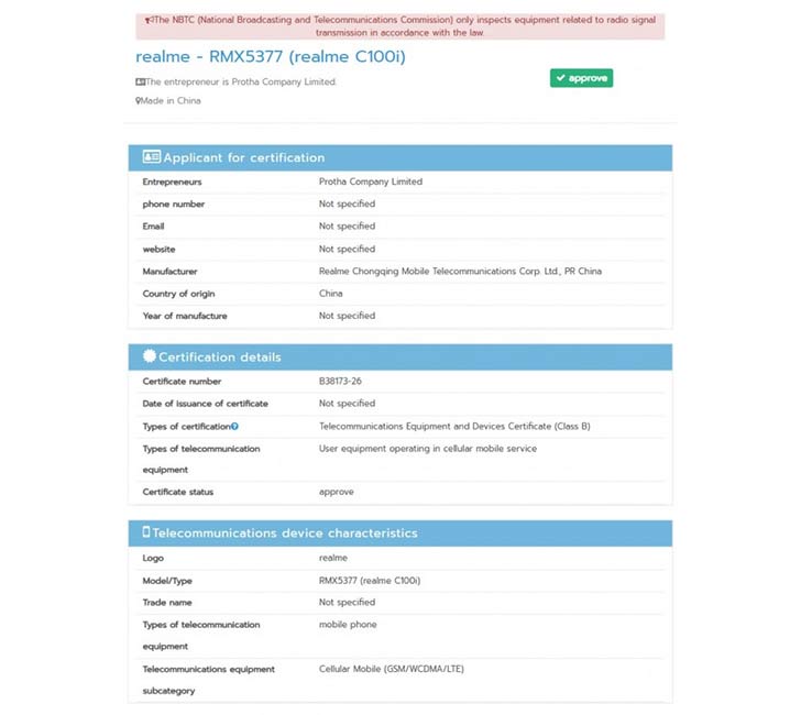We’ve covered pretty much everything the listings had about the Realme C100i. The regions we mentioned at the start, and Thailand, could be among the first places where the C100i is expected to launch. Thailand’s NBTC regulator has certified the phone.