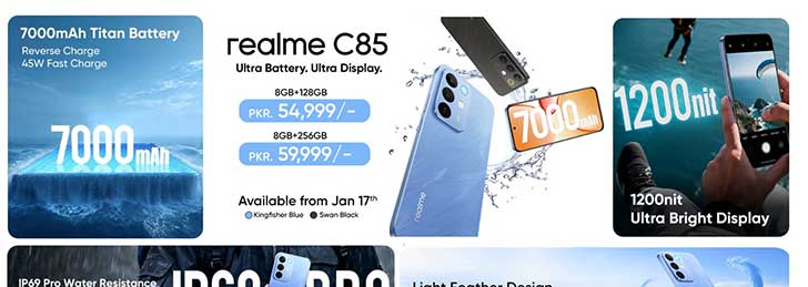 The realme C85 will be available in Pakistan in two storage variants: 128GB at PKR 54,999 and 256GB at PKR 59,999, ensuring users can choose the model that best fits their needs.