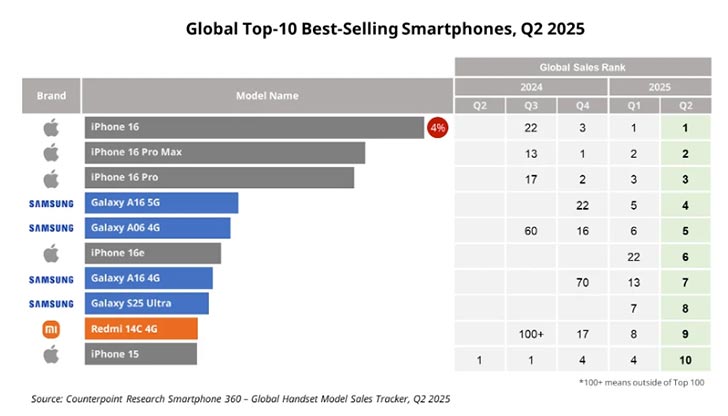 You have the expected premium set of devices in the top spots. Apple has taken its usual 1st, 2nd, 3rd, and 4th ranks with the iPhone 16 lineup. Of course, they are not alone, because the runner-ups are Samsung’s own Galaxy A16 and A06. They are at numbers 5 and 6.