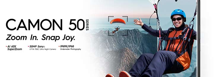 The AI 60X Super Zoom in TECNO CAMON 50 Pro smartphone allows users to capture distant subjects with impressive clarity, making it ideal for travel, events, and outdoor photography. From cityscapes to landscapes, every detail remains sharp even at extreme zoom levels. Adding to its versatility, the CAMON 50 Pro introduces advanced underwater photography, enabling users to capture stunning photos and videos even in challenging conditions with Aqua Mode. Combined with IP68/IP69K Water and Dust Resistance, the device is built to perform wherever life takes you.