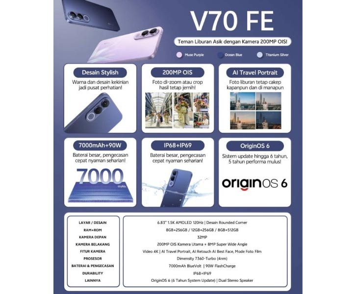 Three color options are expected here: Muse Purple, Ocean Blue, or Titanium Silver. All the hardware is run by a Dimensity 7360 Turbo chip on the Vivo V70 FE. That SoC has 8 cores and a 2.5GHz boost clock. This chip was also used on the Vivo V60 Lite before the V70 FE model.