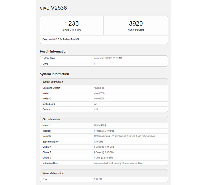 They will definitely pair that setup with Android 16 and Origin OS 6. All of that hardware culminates in 1235 single-core points and 3920 multicore figures. Geekbench didn’t have anything else to reveal. But here’s a screenshot of the listing anyway, in case you want to dig a little deeper.