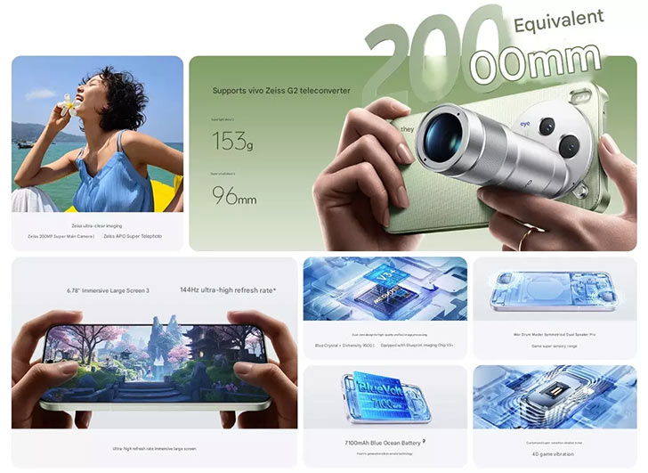 The X300 Pro sibling had a 200MP telephoto and 50MP main camera. The new Vivo X mobile flipped things around. The main lens holds a 200MP Alpha OIS shooter. And there’s a 50MP periscope telephoto (3x) Zeiss APO sensor right next to it. They’ve also included a 50MP ultrawide 119˚ view camera inside that circular deco.