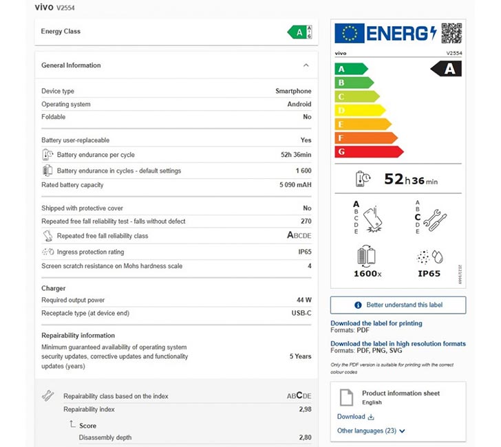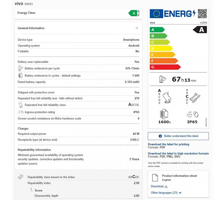 The so-called Vivo Y21 5G got itself listed on the EU Energy certification as model V2553. We saw that number on the SIRIM database, where it was actually addressed as Y21 5G. Apparently, there’s another model number for the same phone, V2554. And that one could be for another market, which has stricter regulations on batteries.