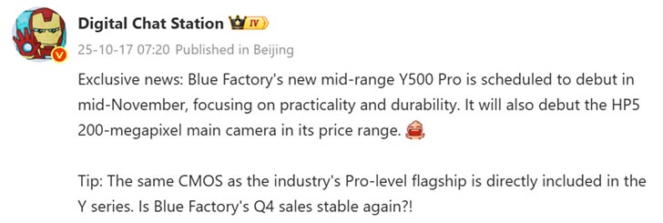 The leak was seen on a Chinese social media post on Digital Chat Station’s account. So it’s coming from a trustworthy source. This tispter has a solid track record, and he’s truly worth his salt in the leak circles. Anyway, his report says the Vivo Y500 Pro may launch in mid-November.