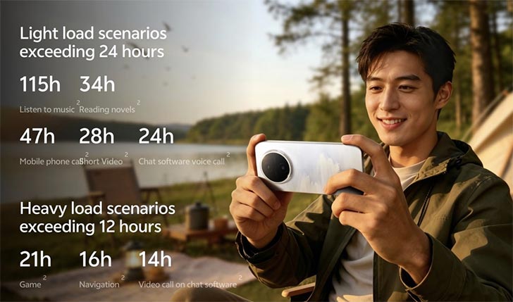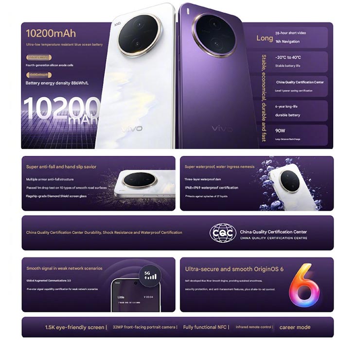 The Vivo Y600 Pro is built around a full 38Wh 10,200mAh Si/C cell. The battery actually has a 15% Silicon content. And we hear its energy density is 886 Wh/L. The phone will run at full load for 21 hours during gameplay. You can also doom scroll short videos for 28 hours. Here are the latest specifications and Vivo phones Prices, featuring models released or listed in April 2026.