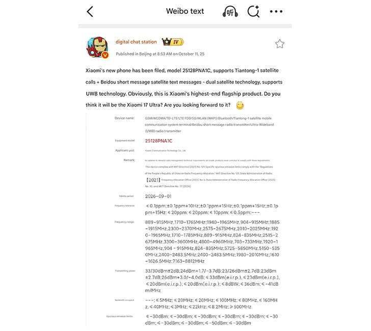 The Ultra picked up a certification from the Chinese regulatory authority a few hours ago. And since their data is open to the public, the secret inadvertently slipped. The listing says Xiaomi 17 Ultra will connect directly with the satellites, Tiantong-1 and Beidou. This will unlock network-free calls and messages on the Ultra phone.
