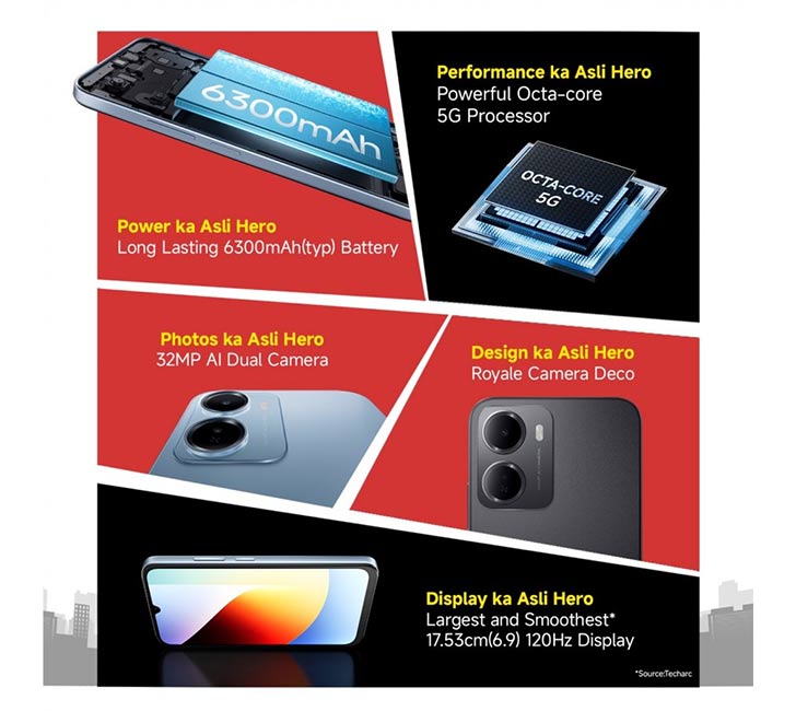 Anyway, the main lens on the camera deco is a 32MP shooter. They’ve linked it to an 8MP selfie shooter on the front, and each side can do 1080p@30fps videos. The fingerprint reader is on the side. There’s also dual-band WiFi here with dual SIM support. Redmi 15A 5G sits at the base cost of $137 (~PKR 38,000).