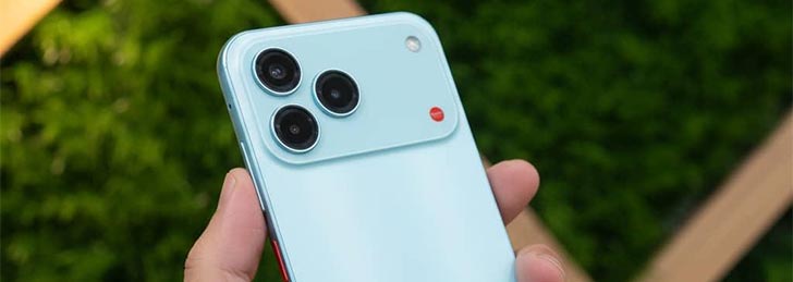 There’s an accented power button on the right and a red dot on the camera island. The horizontal camera bar mounts three black lenses on one side and the flash on the other end. It’s definitely mimicking the iPhone 17 Pro. But there’s only one camera on the back that actually functions.