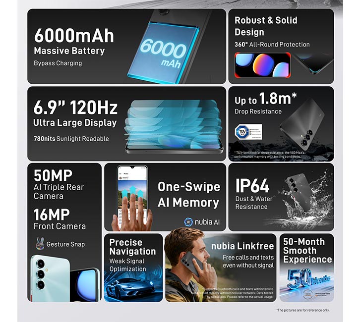 Its ability to sustain a 1.8-meter fall is Nubia V80 Max’s biggest claim. The design is quite durable. All four corners are reinforced, sort of 360° impact protection. TUV SUD tested this phone for an IP64 rating, and SGS gave it a 50-month performance fluency certificate as well.